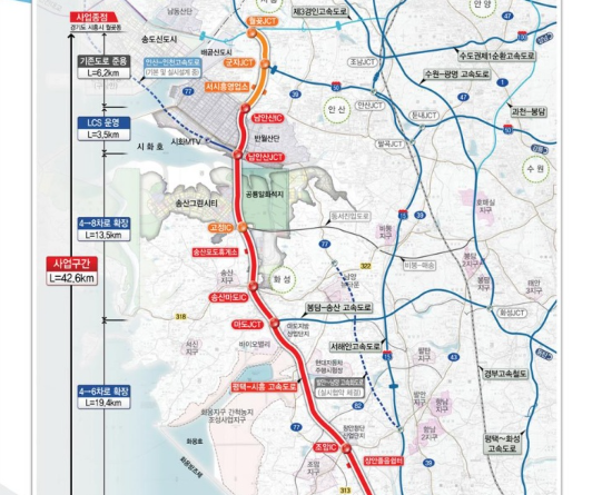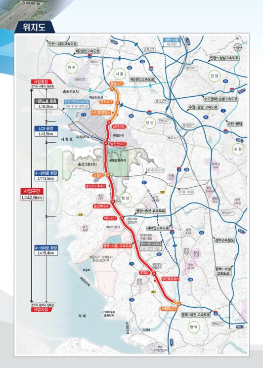 This project is a project to expand a 36.4km section of the current 42.6km total length of the Pyeongtaek-Siheung Expressway from the existing 4-lane round trip to 6-8 lanes round trip.