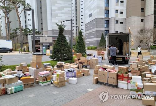 Packages are left near the entrance of an apartment complex in eastern Seoul on April 2, 2021. (Yonhap)