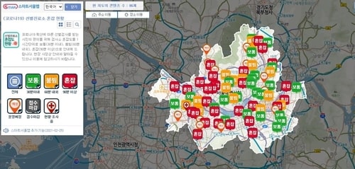 The Smart Seoul Map, available at the URL address https://map.seoul.go.kr/smgis2/short/6NjT7, was updated to reveal the level of crowds in line waiting to be tested at some 80 testing centers across the city, according to city officials.