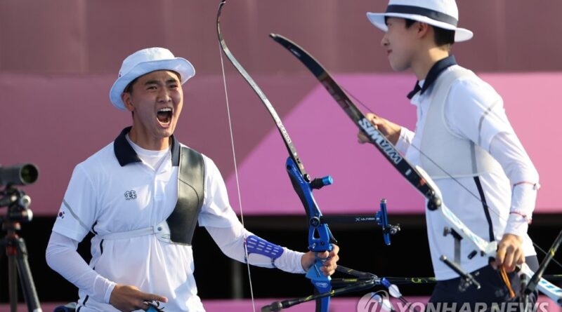 The 17-year-old archer from South Korea teamed up with An San for the inaugural Olympic gold in the mixed team event in Tokyo on Saturday, about 24 hours after declaring his goal of winning three medals here. They beat the Dutch tandem of Gabriela Schloesser and Steve Wijler by the set score of 5-3.