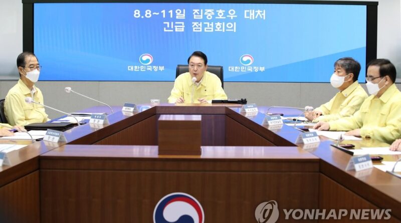 SEOUL, Aug. 9 (Yonhap) — President Yoon Suk-yeol presided over an emergency meeting Tuesday to respond to the heaviest rainfall in 80 years that left seven people dead and six others missing, his office said.