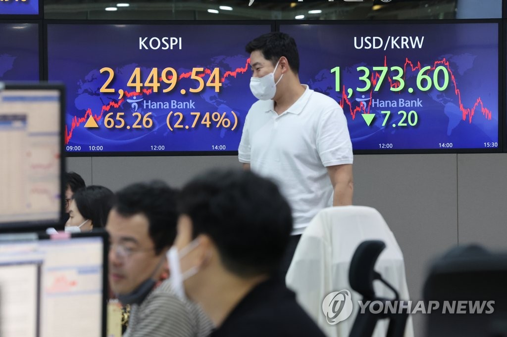 The Korea Composite Stock Price Index (KOSPI) advanced 65.26 points, or 2.74 percent, to 2,449.54. Trading volume was moderate at 361.7 million shares worth 9.05 trillion won (US$6.58 billion) with gainers far outpacing decliners 771 to 127.