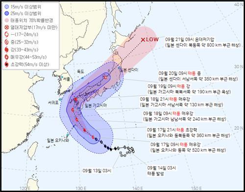With a central atmospheric pressure of 920 hectopascals and a maximum wind speed of 53 meters per second, this year’s 14th typhoon was passing waters 520 kilometers east of Okinawa at 9 a.m., according to the Korea Meteorological Administration (KMA).