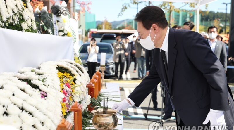 SEOUL, Sept. 27 (Yonhap) — President Yoon Suk-yeol on Tuesday visited a mourning altar for seven people who died in a fire at a Daejeon outlet mall earlier this week.