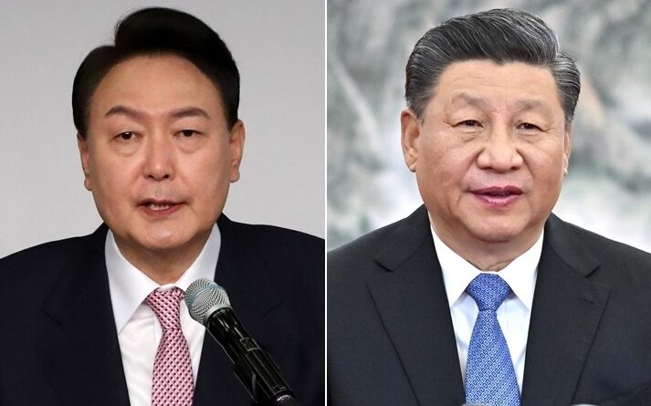 This compilation image shows President Yoon Suk-yeol (L) and a file photo of Chinese President Xi Jinping provided by Xinhua. (Yonhap)