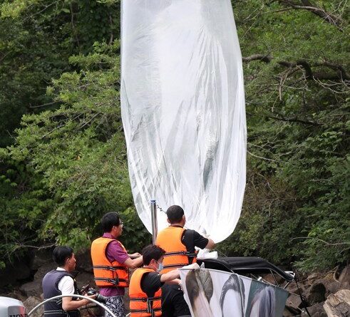 In this file photo, police officers collect a balloon containing anti-Pyongyang leaflets at a mountain in Hongcheon, a town in South Korea’s northeastern province of Gangwon, on June 23, 2020. Fighters for a Free North Korea, a Seoul-based organization of North Korean defectors advocating for North Korean human rights, claimed it sent such balloons toward North Korea in the South Korean border town of Paju, north of Seoul, the previous day. (Yonhap)