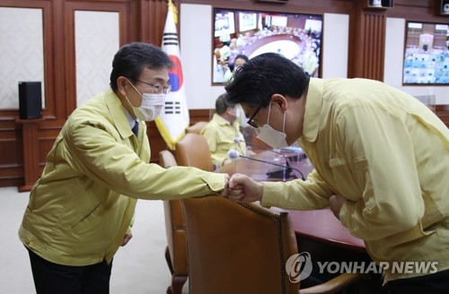 Newly appointed Interior and Safety Minister Jeon Hae-cheol (L) pumps fists with new Health and Welfare Minister Kwon Deok-cheol ahead of an interagency meeting on the coronavirus at the government office complex in Seoul on Dec. 24, 2020. (Yonhap)