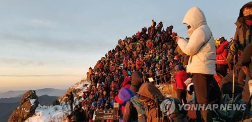 This file photo provided by a national park authority shows crowds waiting for the year’s first sunrise on top of Mount Jiri in southwestern South Korea on Jan. 1, 2020. (PHOTO NOT FOR SALE) (Yonhap)