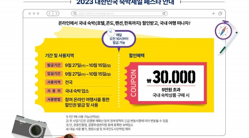 Meanwhile, in addition to the 2023 Korea Accommodation Sales, a nationwide Accommodation Sale Festa is also planned in October, and issuance and room reservations are possible from October 27 to November 24.
