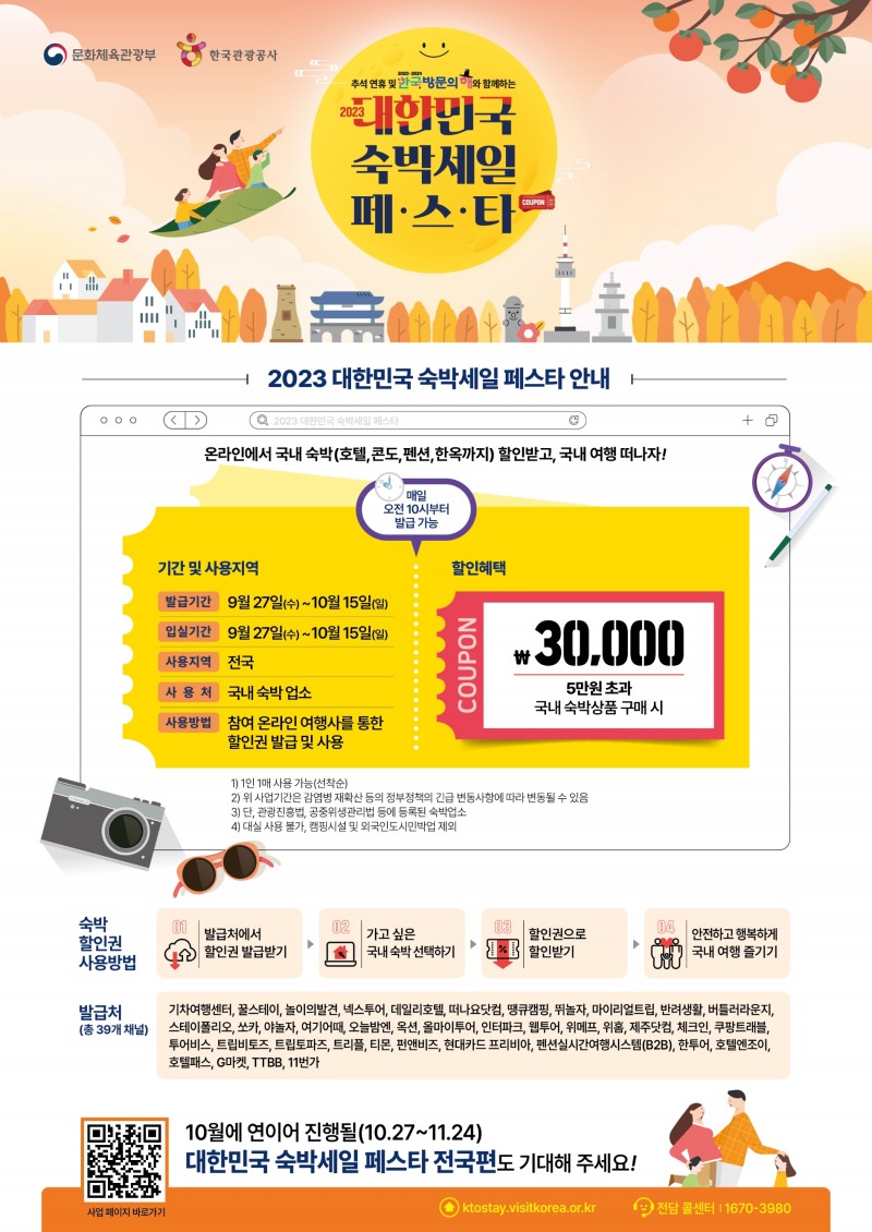 The 2023 Korea Accommodation Sales coupon application period, which is issued on a first-come, first-served basis at 10 a.m. every day, is also applicable only to lodging reservations for accommodations from September 27 to October 15.