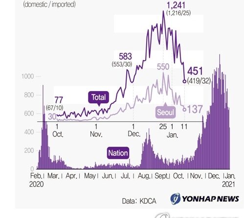 The country has enforced the Level 2.5 social distancing scheme in the greater Seoul area, which is the second highest in the country’s five-tier scheme, and Level 2 rules in other areas since Dec. 8. Health authorities extended the measures until Jan. 17.