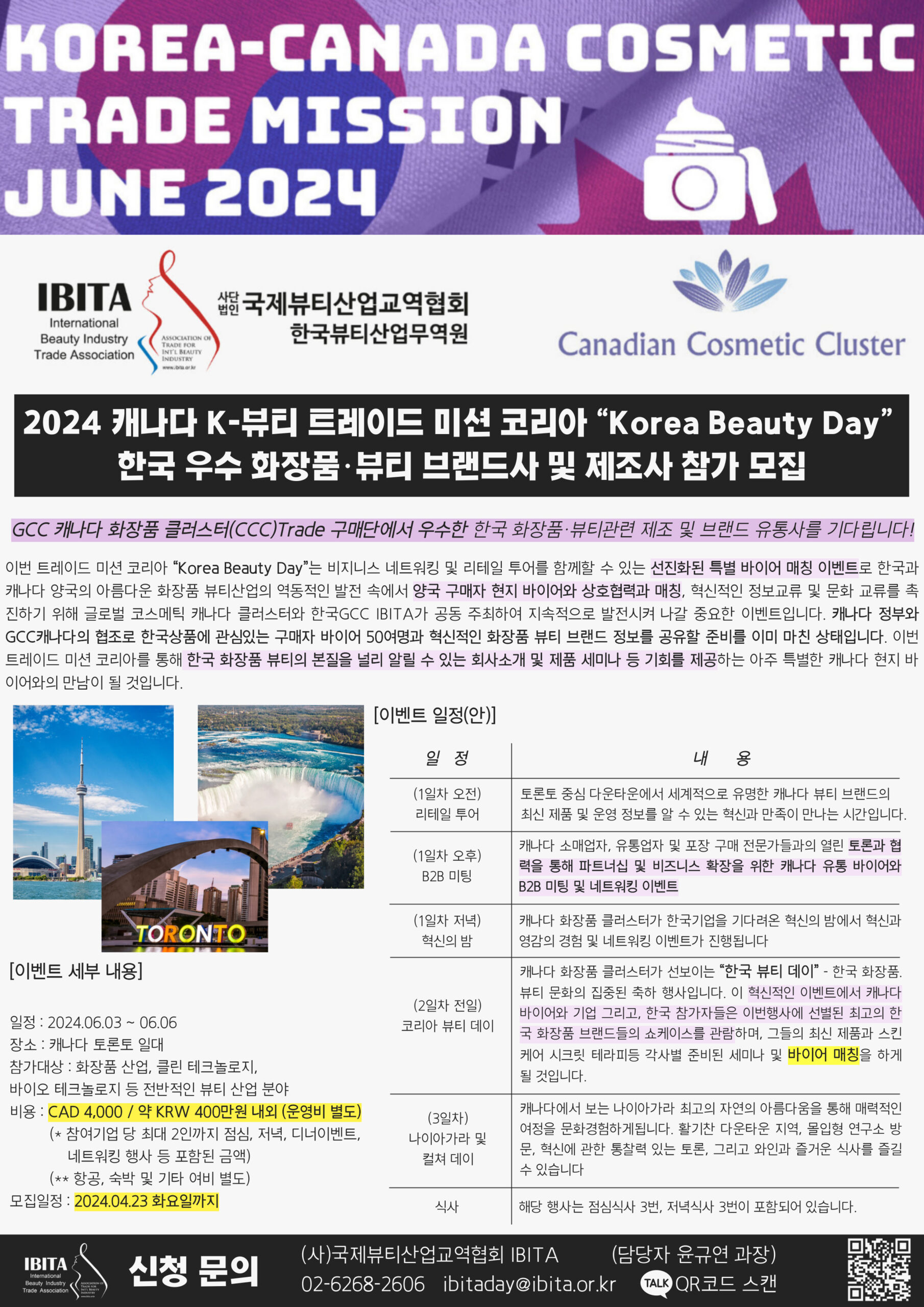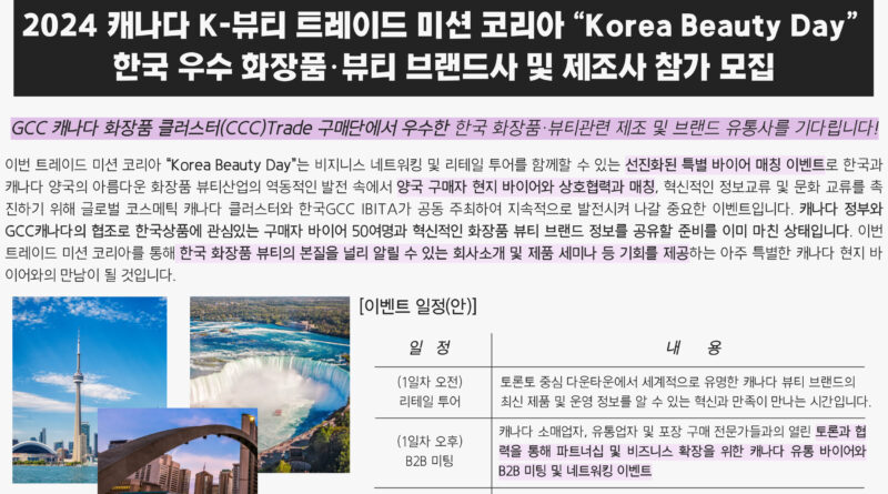 The “2024 Mission Korea to Canada,” taking place in Toronto from June 3 to 6, is a direct follow-up to the cooperation agreement with the Canadian cluster, aiming to facilitate export consultations, conferences, and networking by directly matching sellers and buyers. The Canadian Cosmetic Cluster (CCC) is prepared to warmly welcome the Korean delegation, highlighting the strategic partnership and export bridge roles between the GCC Canada headquarters and the Korean headquarters against the vibrant cityscape of Toronto and the breathtaking natural beauty of Niagara Falls.