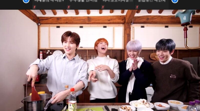 As Woobin — apparently the group’s most prominent chef — deftly chops vegetables and ponders adding certain ingredients, his team members constantly check a monitor in front of them and chit chat with a group of viewers who are watching the livestreamed cooking session.