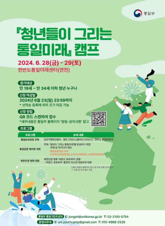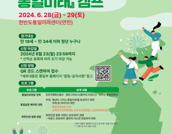 The Ministry of Unification announced that it will hold the “2024 Unification Future Drawn by Youth” camp for domestic youth from June 28 to June 9. This event is intended to promote new unification discourse and collect diverse opinions from young people. Various activities will be held under the theme of the unification future that young people dream of and its implementation plans.