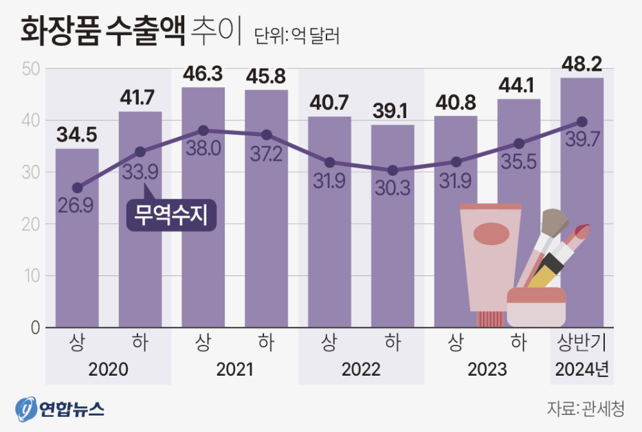 In addition, during the first half of the year, cosmetics imports amounted to $850 million (about 1.2 trillion won), and the trade balance recorded a surplus of $3.97 billion (about 5.5 trillion won), also the highest ever.