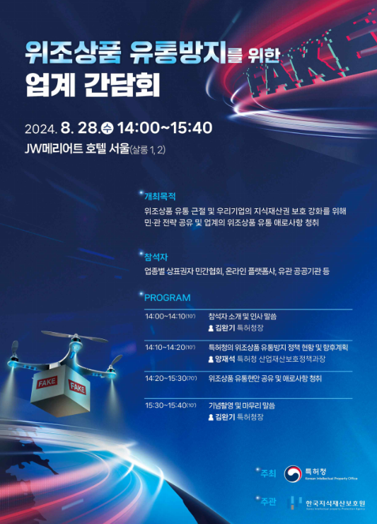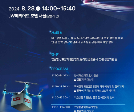 The Korean Intellectual Property Office (Director Kim Wan-ki) will hold an “Industry Meeting on Prevention of Distribution of Counterfeit Products” at the JW Marriott Hotel (Seocho-gu, Seoul) at 14:00 on Wednesday, August 28, attended by private associations of trademark holders by industry, online platform companies, and related public institutions as part of on-site communication. 」 was held.