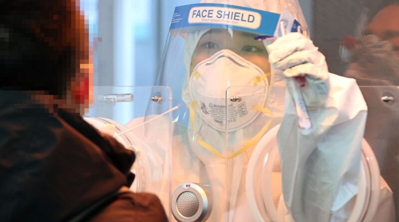A health worker collects a specimen from a person for COVID-19 testing at a temporary screening station in Seoul on Feb. 3, 2021. (Yonhap)hide caption